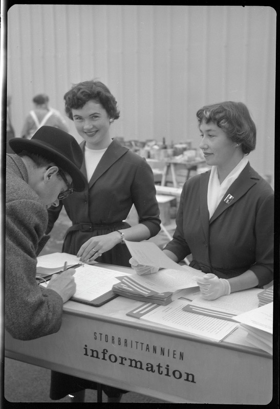 Bilden föreställer två kvinnor bakom en informationsdisk som besöks av en man. På disken finns en skylt med texten Storbrittanien information. På disken ligger broschyrer.