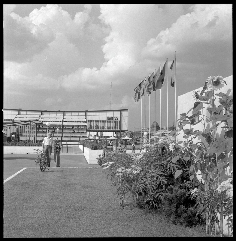 Bilden föreställer en gångbana med personer till vänster. Till höger plantering och flaggstänger. I bakgrunden byggnad med skylten Bar55.