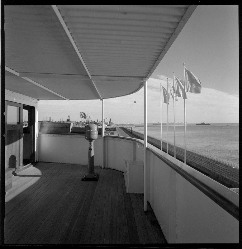 Bilden föreställer en modell av kommandobryggan på en båt. I bakgrunden flaggstänger samt en mur och bakom den havet.