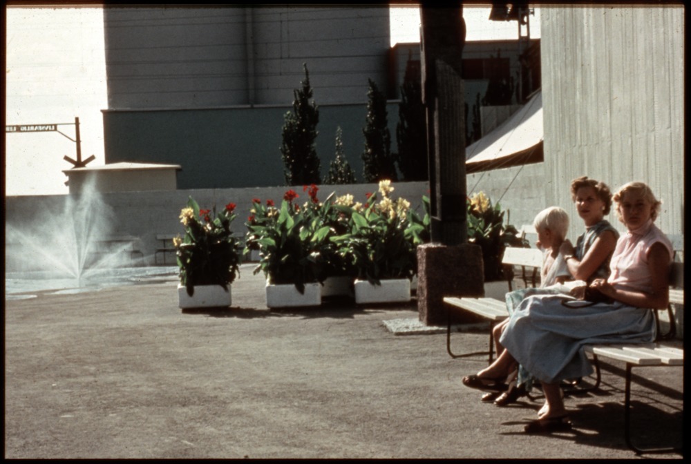 Bilden föreställer en öppenplats. Till höger bänkar med två kvinnor och en pojke. I bakgrunden vita tråg med växter och bakom dem del av byggnader.