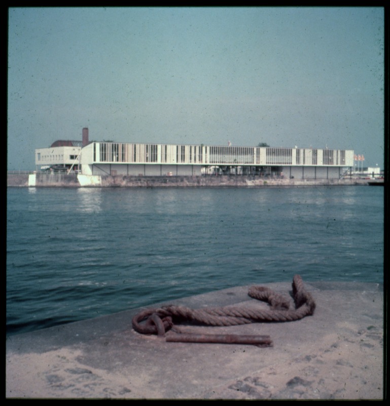 Bilden föreställer i förgrunden kajkant med tross på sedan hamnyta. I bakgrunden pir med en lång byggnad på.
