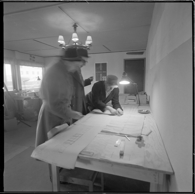 Bilden föreställer tre suddiga personer som står vid ett bord och arbetar med något, i ett större utrymme. Där finns en skrivbordslampa och en lampa i taket