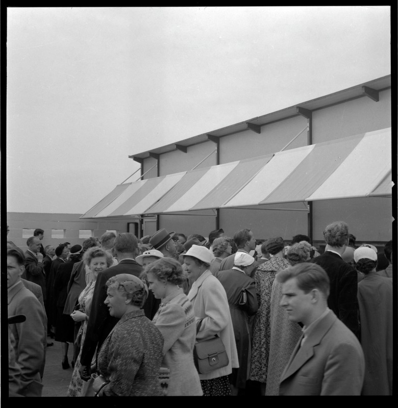 Bilden föreställer människor stående på en öppen yta framför en byggnad. Människorna är vända på olika håll.