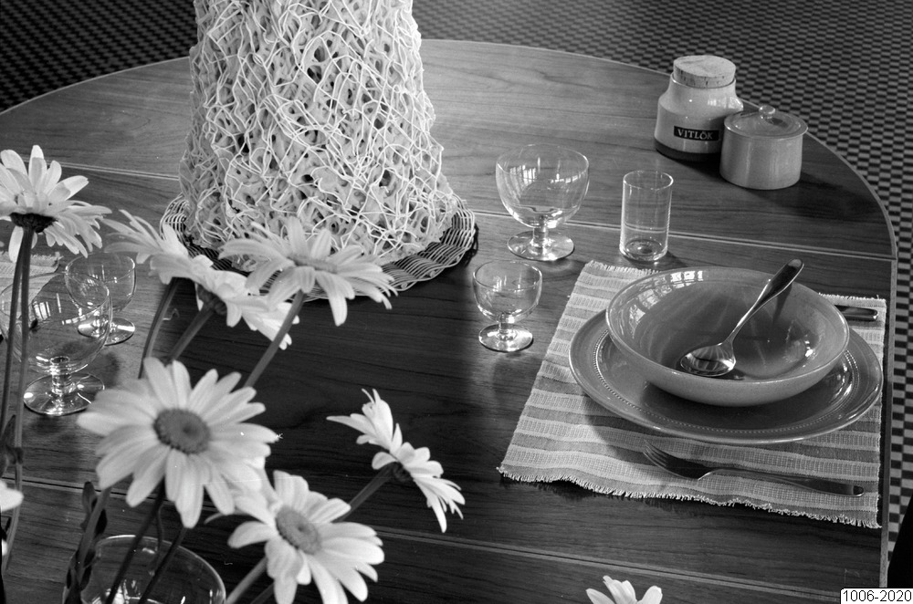 Bilden föreställer ett dukat bord. Fokus på ett kuvert med tablett, tallrikar, bestick och glas. Vid sidan står en stor spettkaka och två burkar den ena med texten vitlök. Där är också en bukett med blommor.