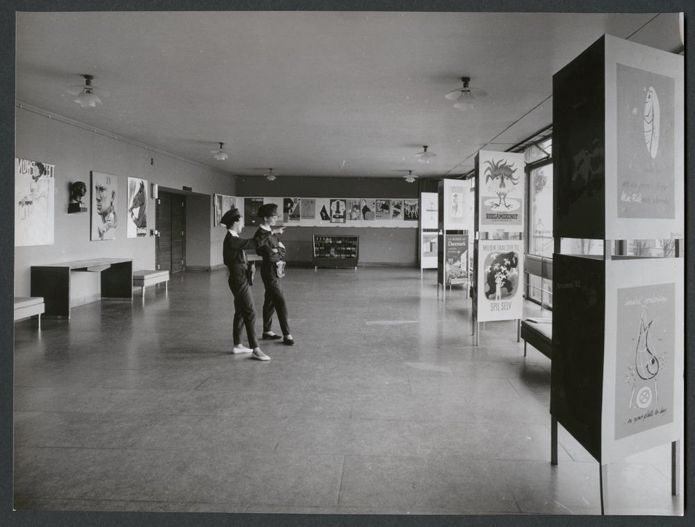 Bilden föreställer två flickor tittar på affischutställningen. Bilden utgörs av en stor hall. På väggar och på skärmar sitter affischer. Mitt i salen står två kvinnor, utmed väggen bänkar och ett bord.