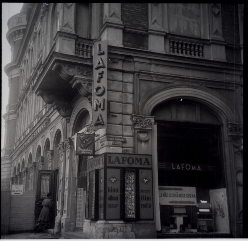 Fotografi som avbildar ett skyltfönster i Lafomas butik. Lafoma var en lokal gren av Hefoma i Landskrona.