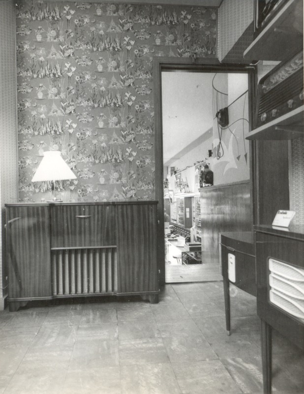 Fotografi från radio avdelningen och ser ner mot foto avdelningen i Hefomas affär på Järnvägsgatan 3 före ombyggnaden 1957-58. Bilden var daterad "1/4 1955".