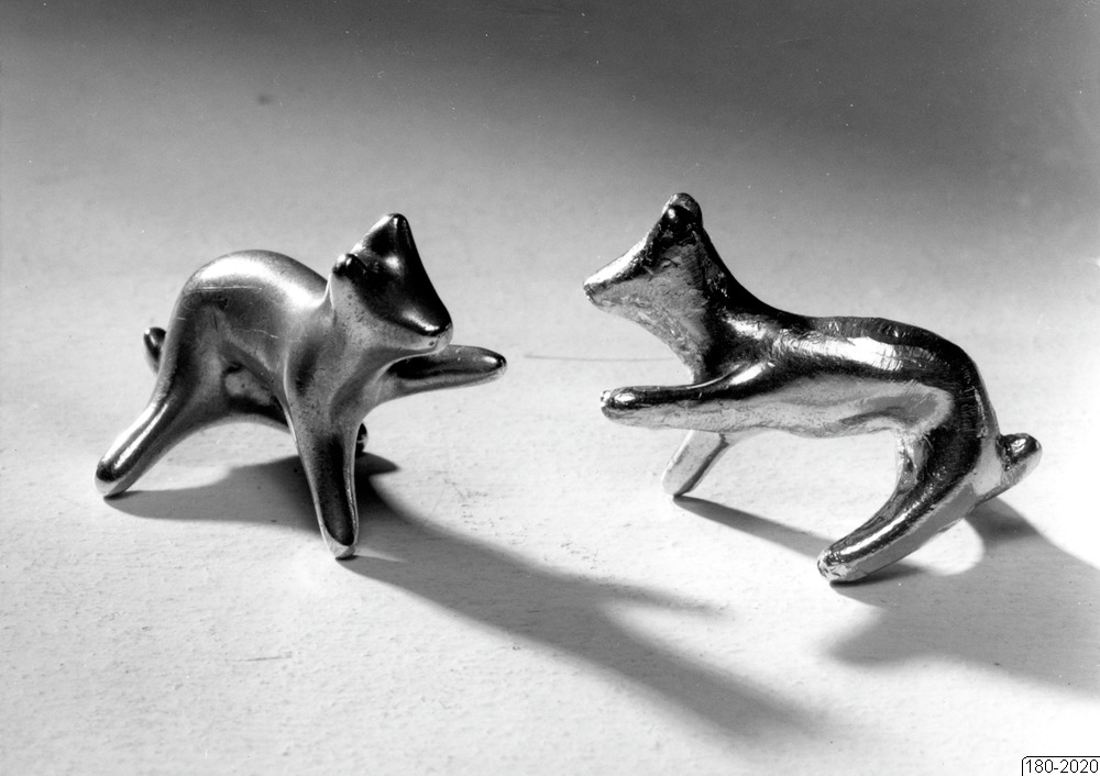 Bilden föreställer souvenir. H55-vovvarna. Två små vovvar i metall.