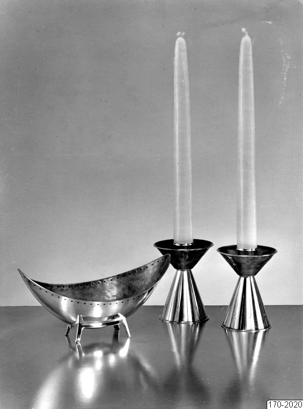 Bilden föreställer W.A. Bolin, hovjuvelerare. Båtformad skål, silver med blå emalj. Komp Barbro Littmarck. Ljusstakar, silver med emalj. Välj någon av våra 300 nyanser! Komp. Lars Hedeman. Till vänster en skål till höger två ljusstakar.