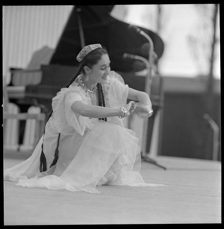 Bilden föreställer en helfigur bild av en kvinna i orientalisk klädsel som i ett moment på en dans sitter på huk. I bakgrunden flygel.