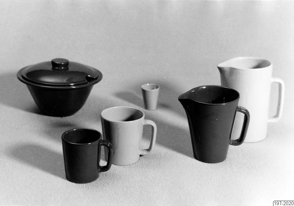 Bilden föreställer "Taffel" Färgglatt ugnseldfast hushållgods. Färger: oliv, viol, rost, gul, svart. Utförande S.O. Burmeister. På bilden två kannor, två muggar ett litet glas samt en karott med lock. Ljus och mörka nyanser.