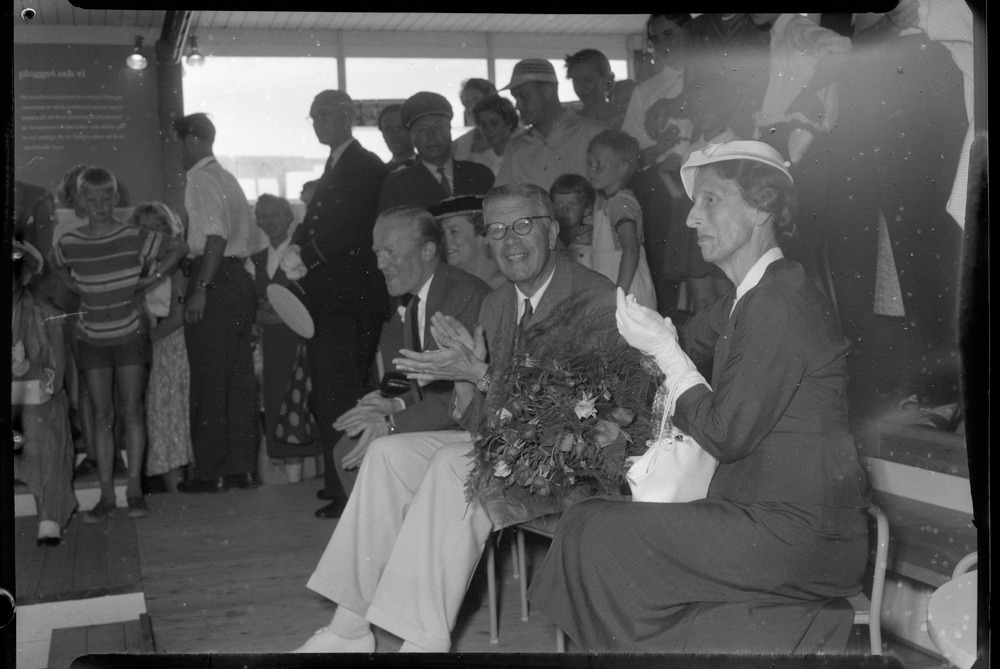Bilden föreställer Drottning Louise och Kung Gustf den VI sittande på en bänk. Till höger en scen och bakom kungaparet en folksamling.