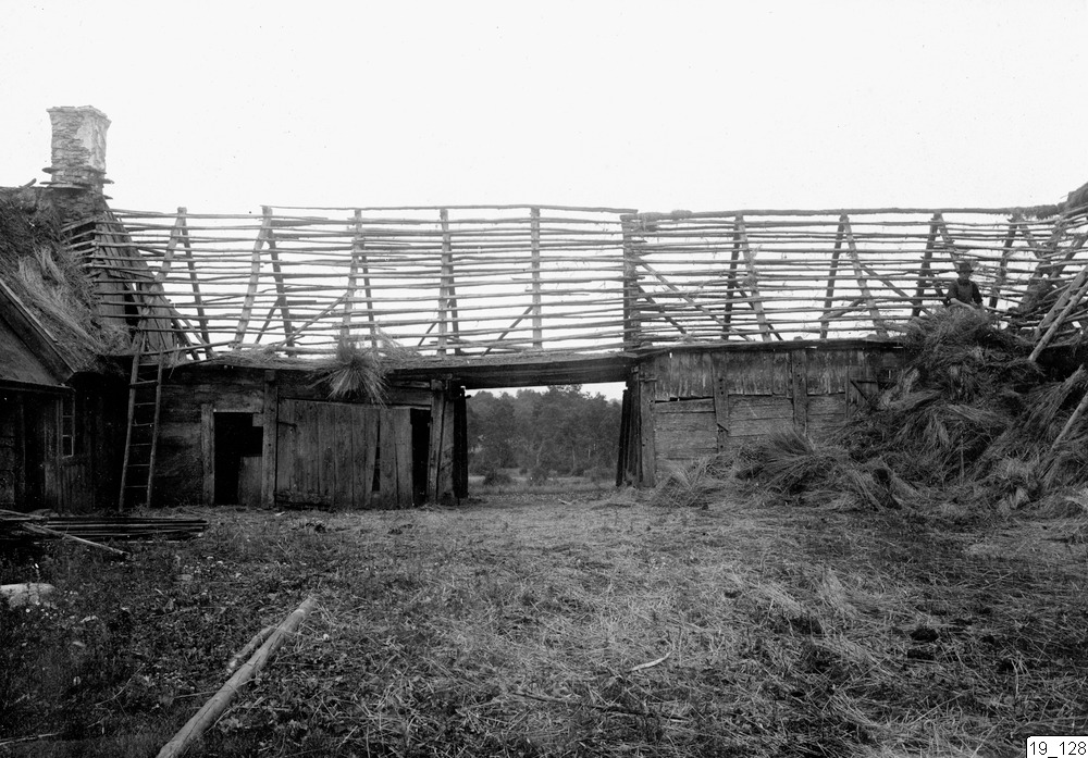 Östra längan, halmen nedriven, exteriör av gårdsidan.
