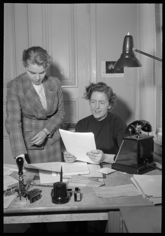 Bilden föreställer två kvinnor på ett kontor bakom ett skrivbord med lampa, telefon, bläckpenna, stämpel och pappershögar.