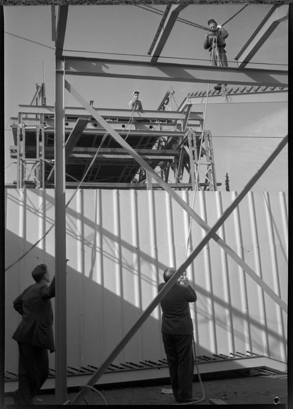 Bilden föreställer en bro under byggnad i stålkonstruktion. Fyra byggnadsarbetare syns.