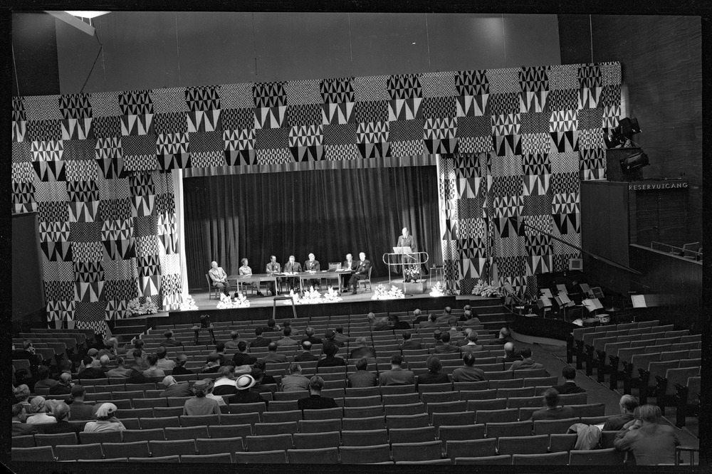 Bilden föreställer en aula. På scenen bord vid vilka det sitter sju personer i högra kanten talarstol med en man. I förgunden salong med sittplatser till stor del fylld av åhörare/publik. Scenen omges av ett vackert drapperi med geometriska mönster.