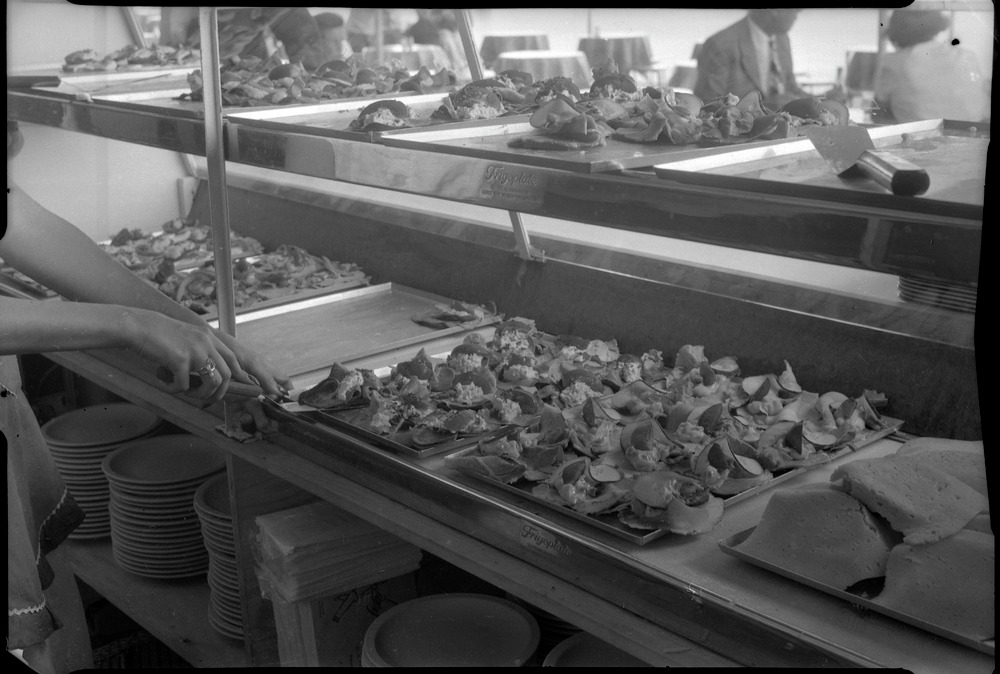 Bilden föreställer disken i en servering med massor av smörgåsar på brickor. På en hylla undertill står det asietter.