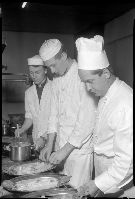 Bilden föreställer tre män i halvfigur med köksklädsel står vid en bänk med uppläggningsfat samt en kastrull.