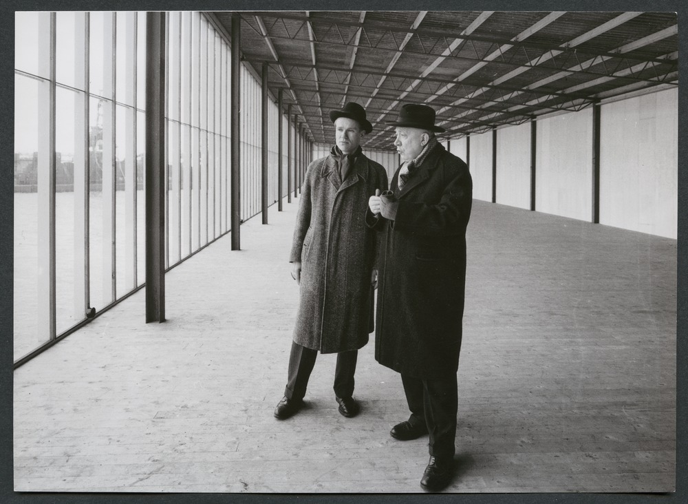 Bilden föreställer Gotthard Johansson (th) i samspråk med Svenska Dagbladets Ulf Hård af Segerstsd i en av utställningshallarna. Två män stående i en tom utställninghall med glasfasad till vänster.