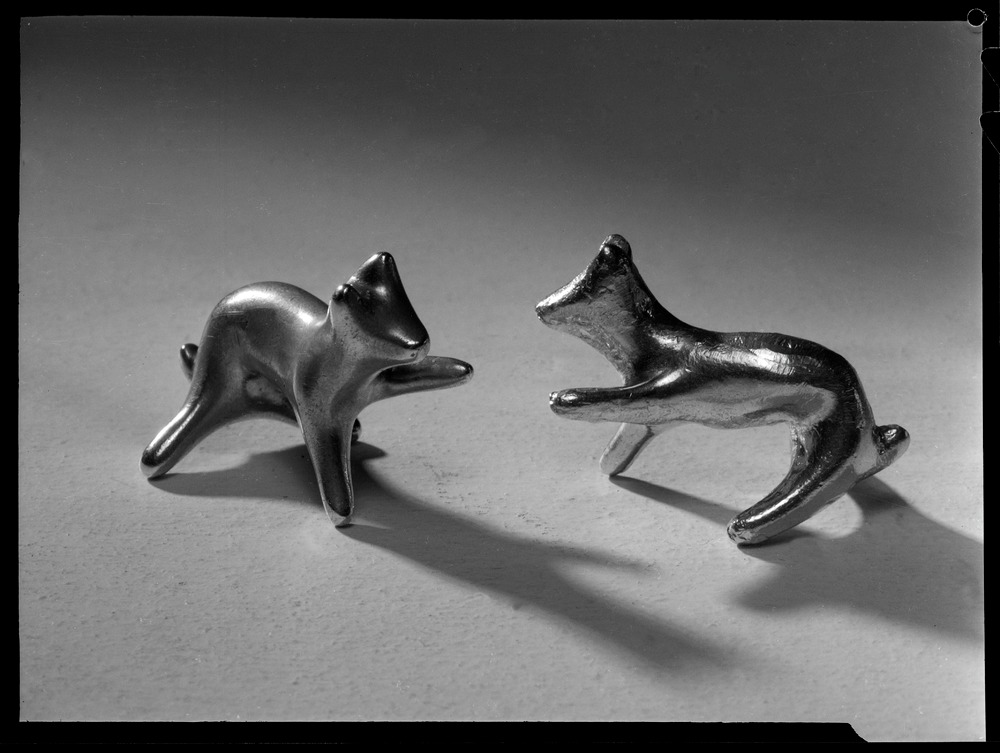 Bilden föreställer två små föremå, skulpturerl, katter eller hundar i metall.
