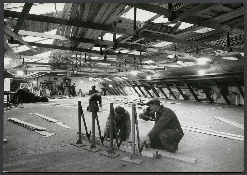 Bilden föreställer insidan av ett fartyg med arbetnade män.