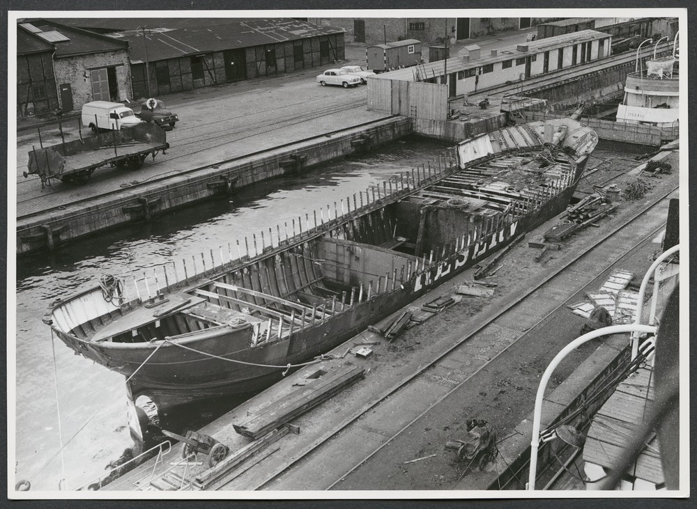 Bilden föreställer ett skepp på väg att förlängas. På vänstra kajen järnvägsvagn, bilar samt byggnader. På högra kajen byggmaterial.