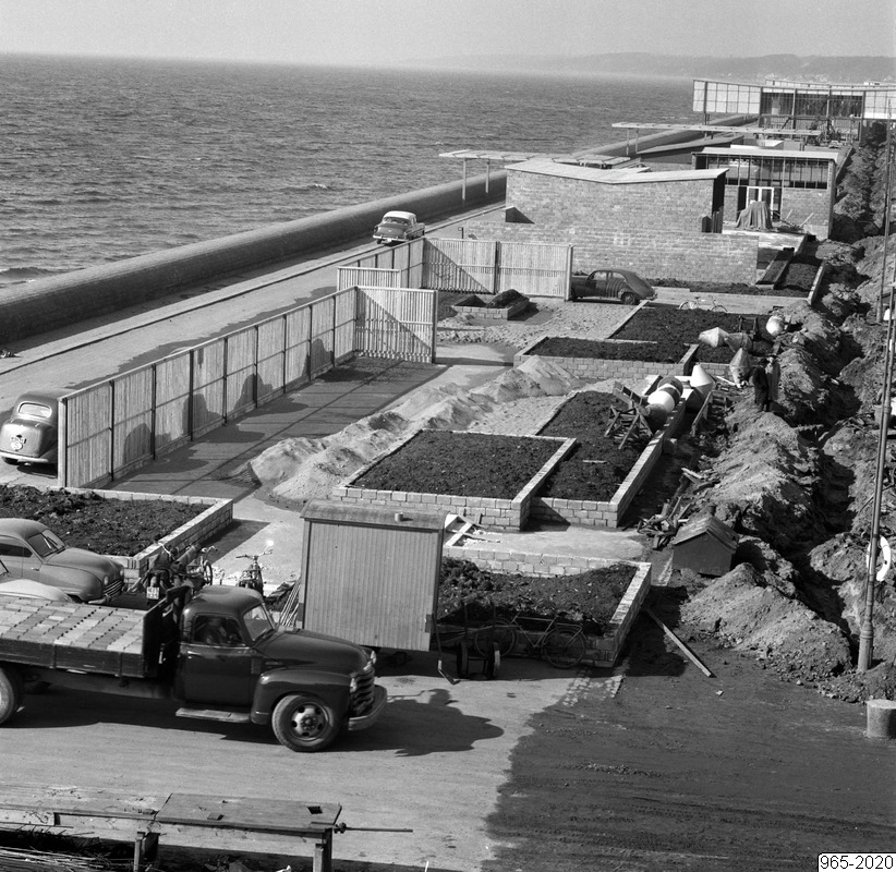 Bilden föreställer utsikt över piren Parapeten med paviljonger och markarbeten. Där ligger högar med beläggningsmaterial. I förgrunden en lastbil. Till höger hav.