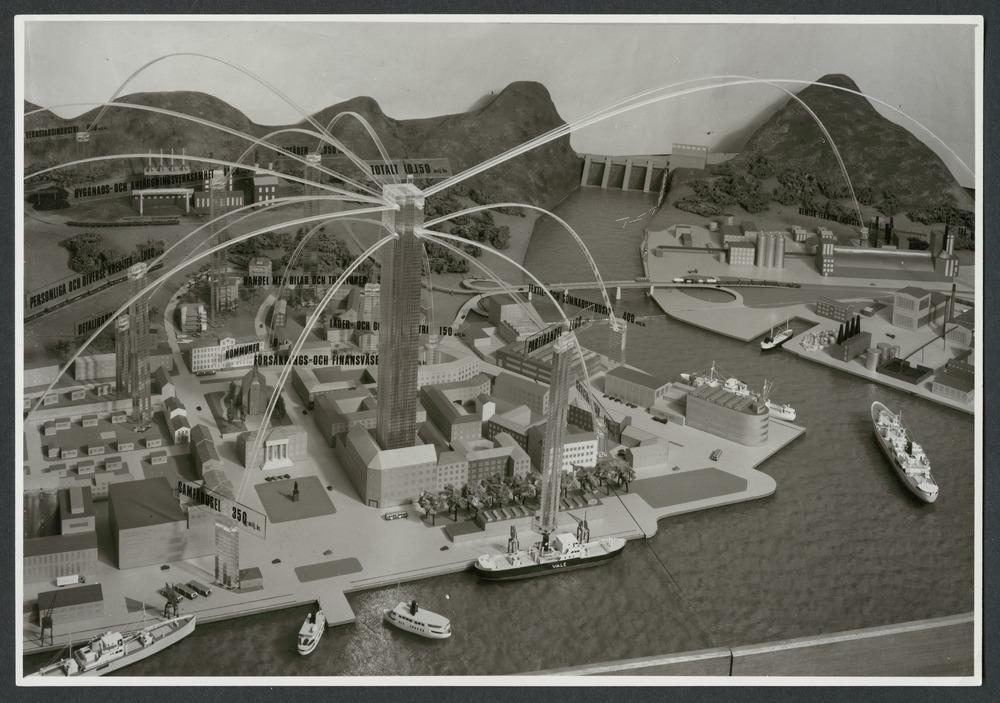 Bilden föreställer fiktiv landskapsmodell i stadsmiljö. Skyltarmed stadens verksamheter ämnesindelade samt siffror på omsättning i miljoner kronor. Landskap med stad, hamn, industri och i bakgrunden berg.