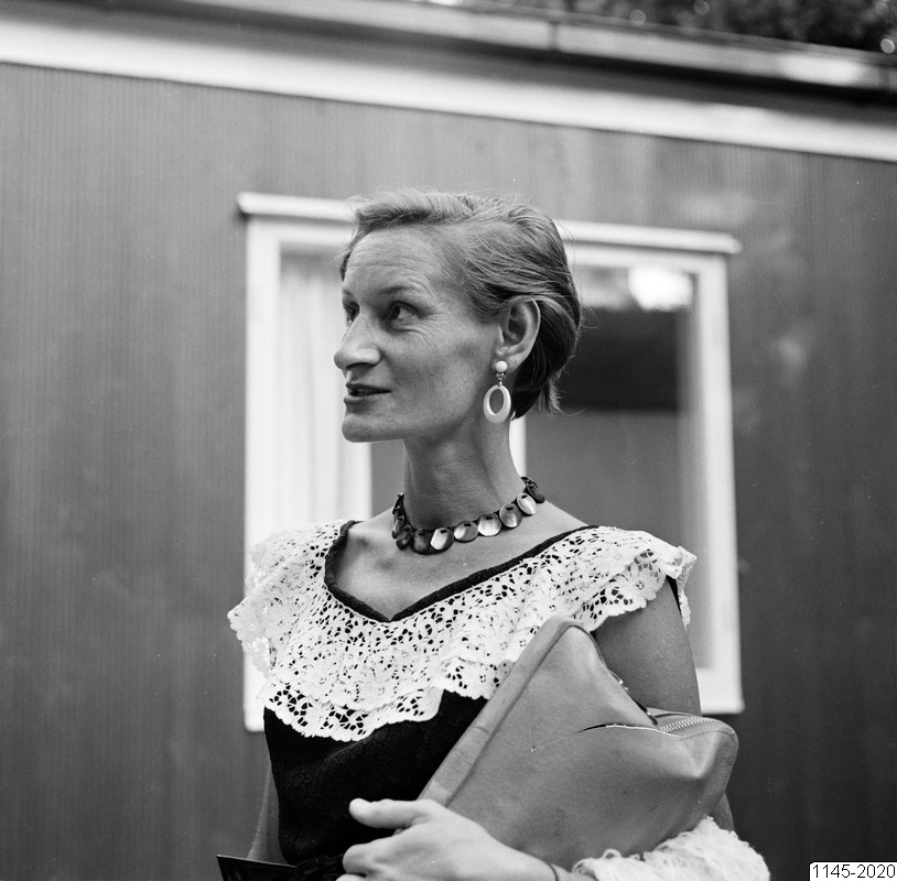 Bilden föreställer en kvinna fotograferad i bröstformat, med blus, halsband och örhänge.