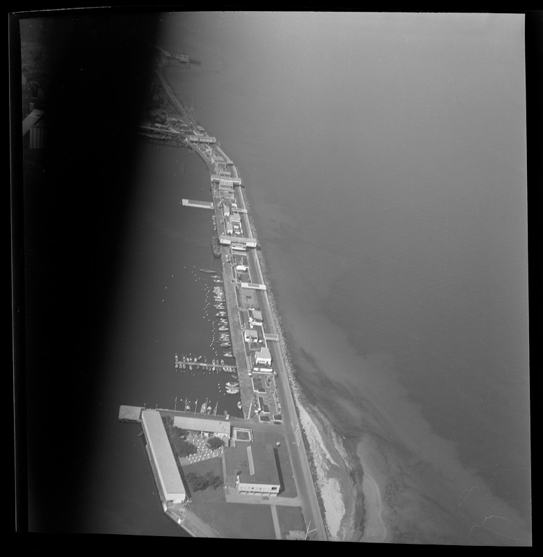 Bilden föreställer en flygbild över del av Parapeten och del av hamnen med sin bebyggelse.