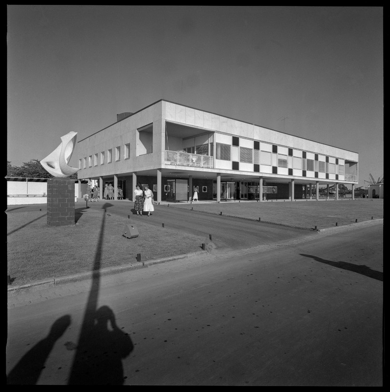 Bilden föreställer paviljong. I fögrunden gångbana, gräsmatta, och skulptur.