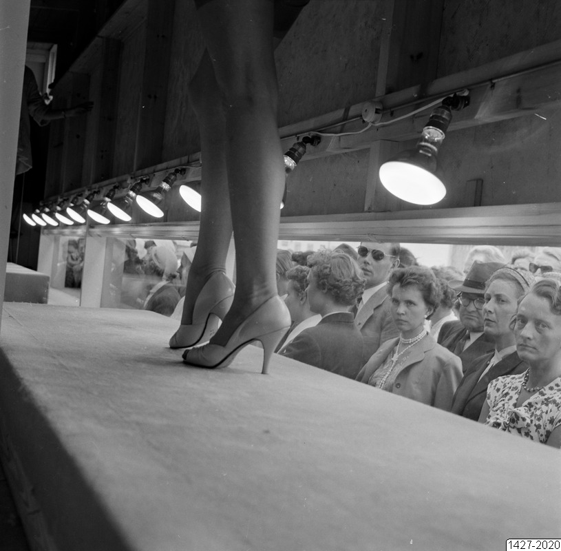 Bilden föreställer en smal scen, där golvet är belyst. Mitt i bild en kvinna från knäna och nedåt med fötter med pumps med klack. I bakgrunden publik.