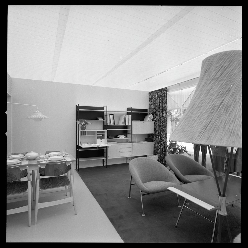 Bilden föreställer ett rum med matbord dukat för fyra. I andra hörnan av rummet ett bord och fåtöljer. En lampa hänger i taket. I bakgrunden en bokhylla med skåp.