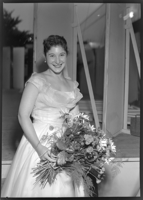 Bilden föreställer en kvinna i trekvartsformat i festlig långklänning och en stor bukett blommor i handen. Diffus bakgrund.
