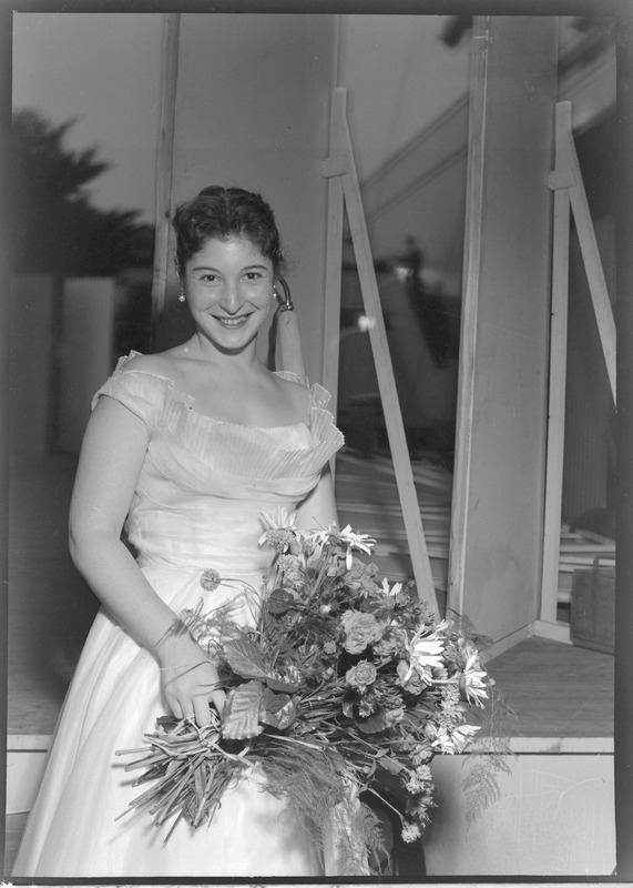 Bilden föreställer en kvinna i trekvartsformat i festlig långklänning och en stor bukett blommor i handen. Diffus bakgrund.