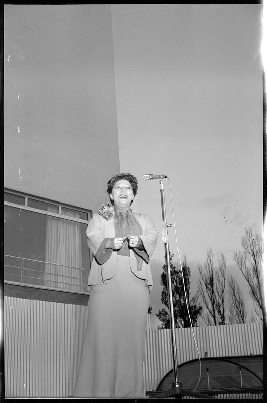 Bilden föreställer en kvinna i princip i helfigur med långklänning stående i hörnet på en scen vid en mikrofon.