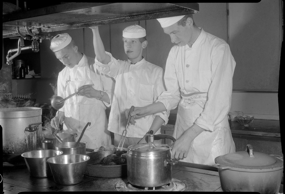 Bilden föreställer tre män i halvfigur med köksklädsel står vid en spis med kastruller och karotter samt köksredskap.