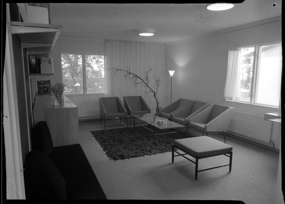 Bilden föreställer ett vardagsrum med fåtölj och bord på en matta. I en hörna och i taket lampor. På väggen hyllor med böcker. Som prydnad en stor grenig gren.