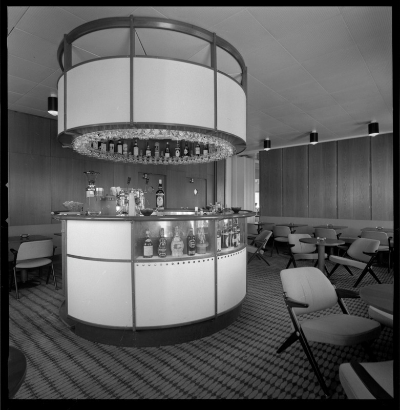 Bilden föreställer en rund bardisk med flaskor och glas mitt i ett rum. Bardisken är omgiven av bord och stolar.