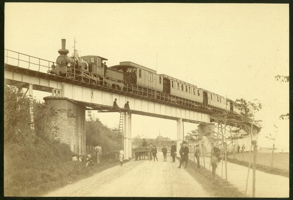 Foto föreställande järnvägsbron över Drottninggatan. Tåget har stannat mitt på bron och det har samlats människior på vägen nedanför. Lokföraren syns i loket och i tågfönstrena skymtar resenärer.