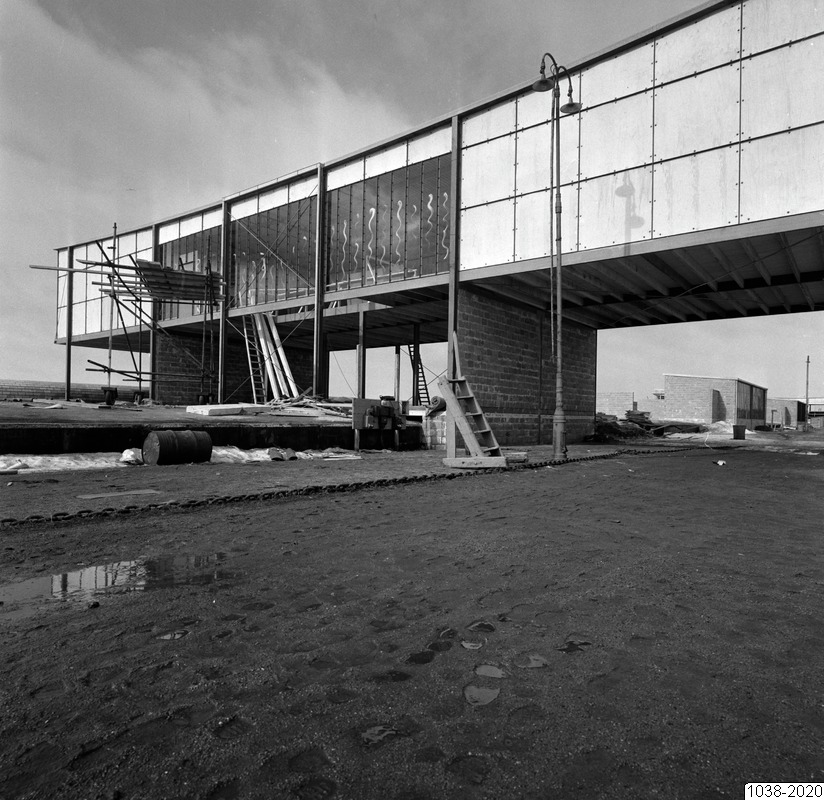 Bilden föreställer en stor öppen yta där någon byggverksamhet pågår. I bakgrunden del av en tvåvåningspaviljong.