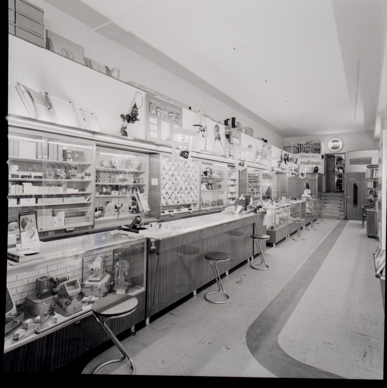 Fotografiavdelningen på Hefomas butik på Järnvägsgatan. Taget före ombyggnaden i slutet av 50-talet. Längst bak i butiken kan man se två dörrar som leder till små bås som man kan lyssna på grammofonskivor i. Dessa dörrarna kan även ses på 2790-2020 och 2791-2020.