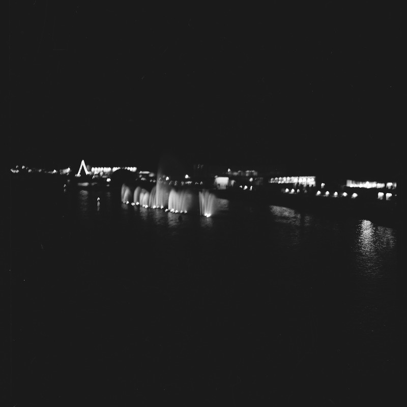 Bilden föreställer en mycket diffus bild på fontänen i hamnen.
