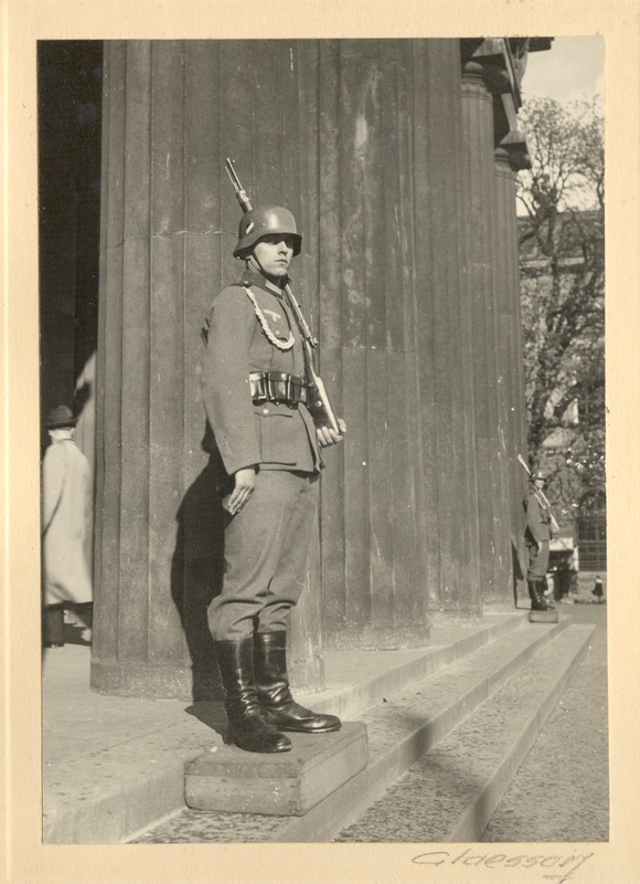 Fotografi taget av och undertecknat av Sture Claesson som avbildar en byggnad i Tyskland kanske i Berlin med en klassisk arkitektur, framför pelarna vaktar tyska soldater. Sture Claesson var ofta på mässor så bilden är troligen tagen i anknytning till en sådan resa. Bilden är troligen tagen någon gång på 1930-talet.