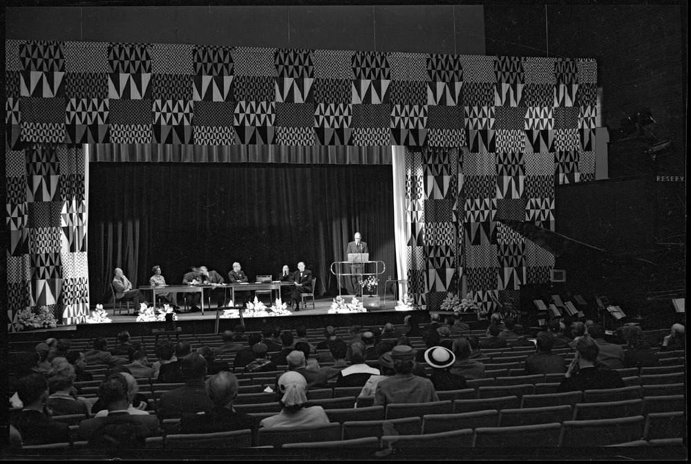 Bilden föreställer en aula. På scenen bord vid vilka det sitter sju personer i högra kanten talarstol med en man. I förgunden salong med sittplatser till stor del fylld av åhörare/publik. Scenen omges av ett vackert drapperi med geometriska mönster.