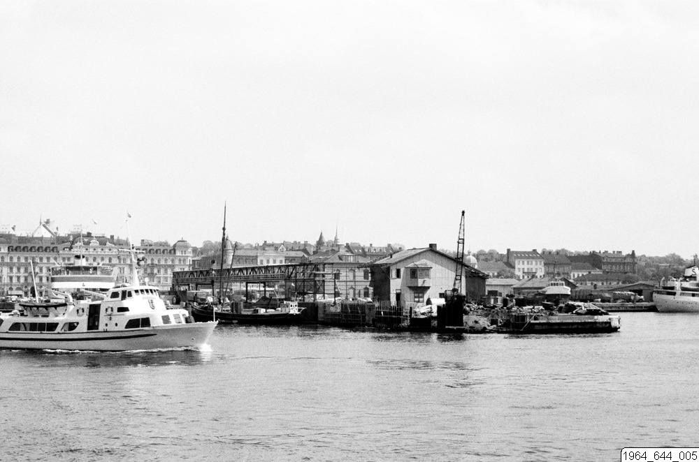 vy över inre hamnen med båt på väg ut i sundet. LB terminalen bygs till.