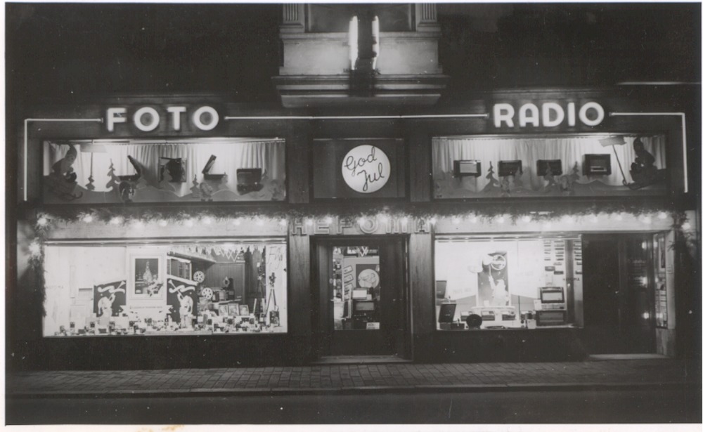 Fotografi som avbildar Hefomas juldekorerade affär på Järnvägsgatan 3. Bilden är tagen efter en av ombyggnaderna av fasaden så bilden är troligen tagen mot mitten av 1900-talet.