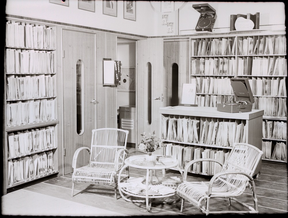 Fotografi som avbildar grammofonavdelningen i Hefomas affär på Järnvägsgatan 3. Dörrarna i bakgrunden leder till små bås där man kan lyssna på grammofonskivor ostört, dessa dörrar är bevarade se; 2790 och 2791-2020. Tagen före ombyggnaden av affären 1957-58.