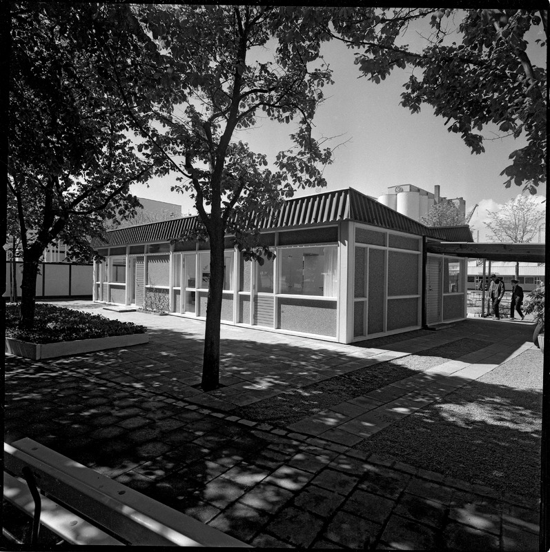 Bilden föreställer i förgrunbden ett stenlagt torg med två träd. Till höger inmurad yta med låga buskar. I bakgrunden paviljong.