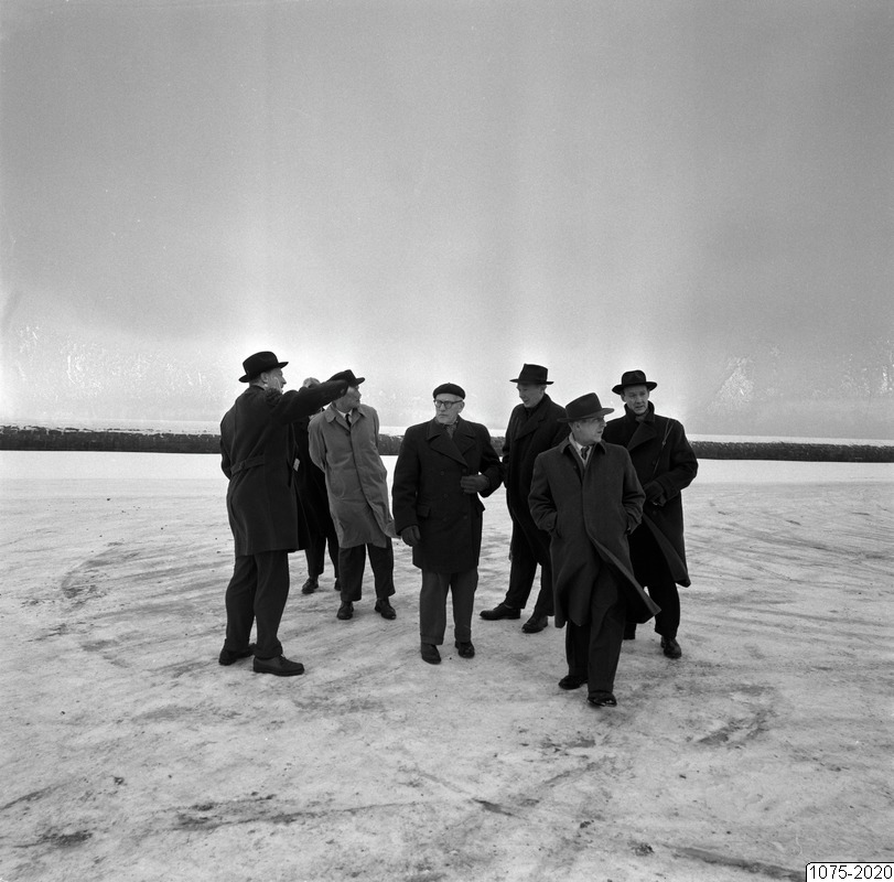 Bilden föreställer sex herrar fotograferade i helfigur stående på en öppen yta.